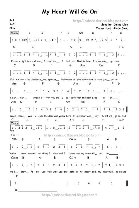 1. tulisin not angka pianika lagu my heart will go on