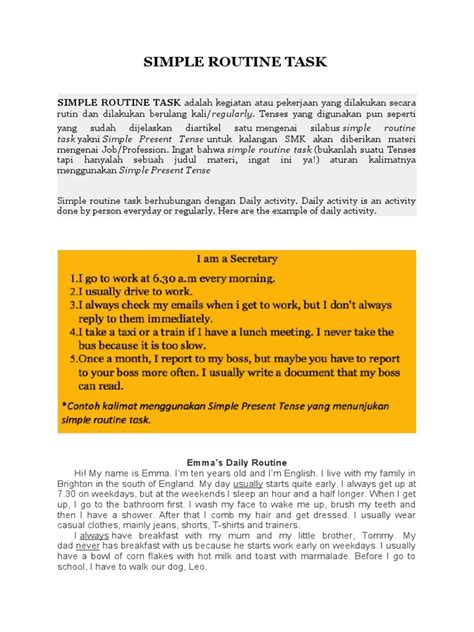 Simple routine task artinya adalah kegiatan atau pekerjaan yang dilakukan secara rutin atau regularly. Tenses yang digunakan untuk menuliskan simple routine task adalah simple present tense.