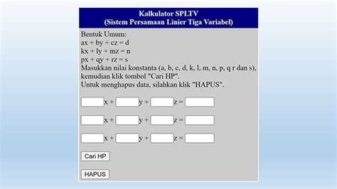 Bentuk Umum :Sistem persamaan linier tiga variabel (SPLTV) adalah bentuk perluasan dari persamaan linier dari dua variabel (SPLDV).
