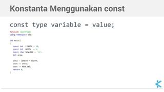 Konstanta adalah jenis identifier yang bersifat konstan atau tetap, artinya nilai dari konstanta di dalam program tidak dapat dirubah / bersifat tetap. konstanta juga sering dianggap seperti variabel, namun nilainya tetap / tidak dapat diubah-ubah.