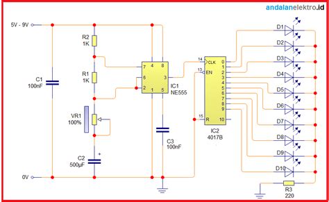 coba anda buat skema rangkaian running led 20 berjalan bolak balik , dan jelaskan tahapan , langkah langkah perakitan serta komponen apa saja yang di gunakan ?